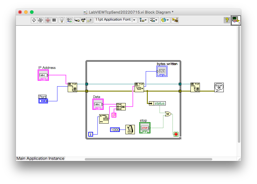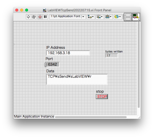 ESP32でのTCP信号の受信について、送信側であるパソコンのプログラムをLabVIEWで作成した例です。ESP32側のプログラムは「4.6.2e ESP32でパソコンからのTCP信号を受信する」と同じです。